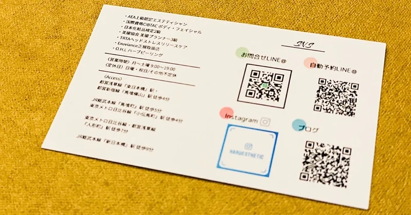 お客様にリピッテの予約専用とお問合せ用LINE、Instagram、ブログのQRコードを名刺の裏に記載して、お客様のお会計の際にお渡ししています。