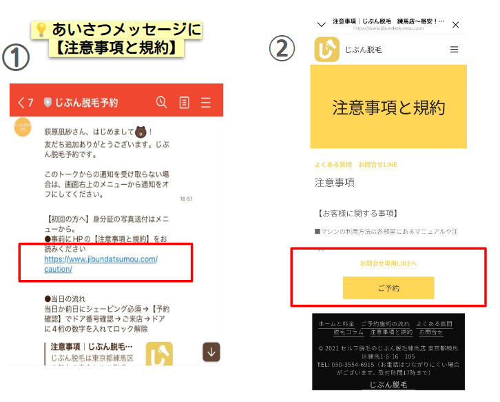 まず初めに、友達追加時に自動送信されるメッセージ内に、店舗ホームページの【注意事項と規約】のリンクを貼り付けています。