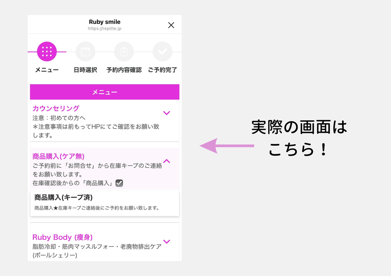 その後、今度は予約用LINEアカウントに「商品購入(キープ済)」というメニューがあるので、そちらを選び、取りに来てもらう日時で予約を取っていただきます。